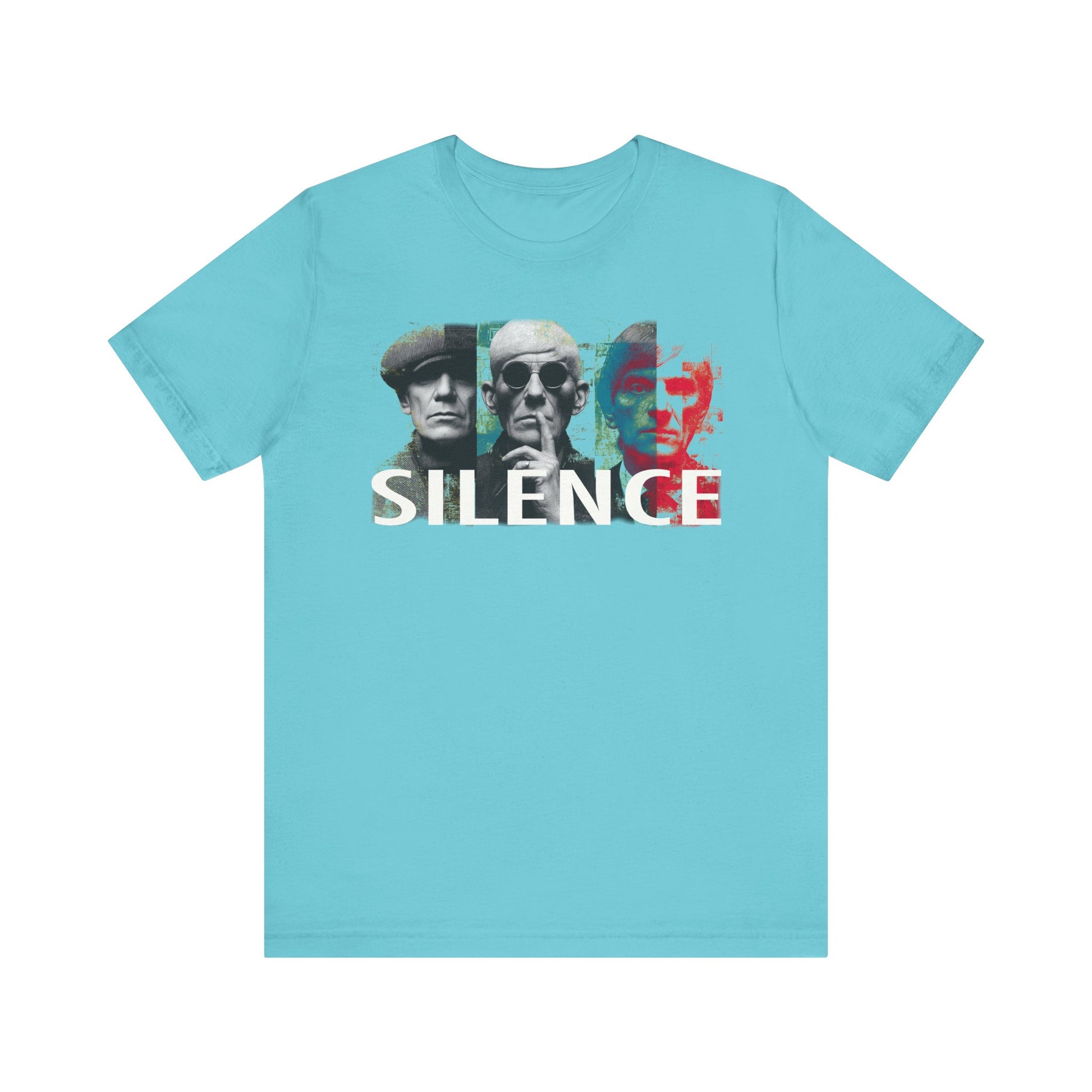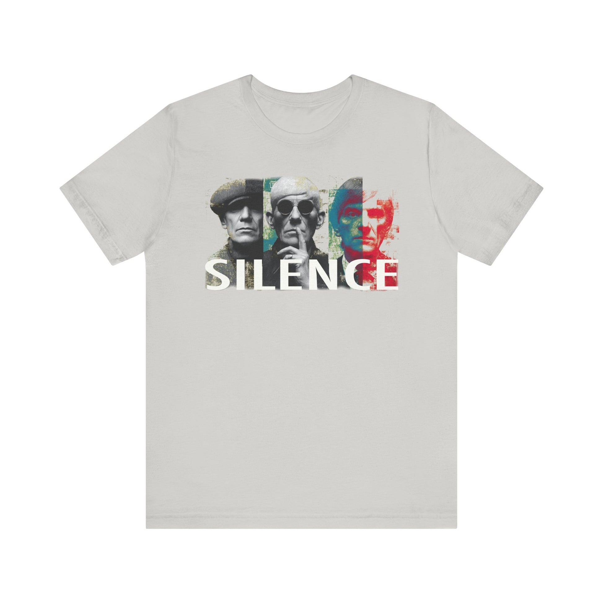 A bold fusion of retro color and modern cool, SILENCE captures the quiet intensity of style and mystery. Three figures — stoic, iconic, and sharply dressed — stand against a grid of distressed yellow, cyan, and red. The central figure, finger raised to his lips, becomes the focal point of this visual command: silence speaks louder than words.