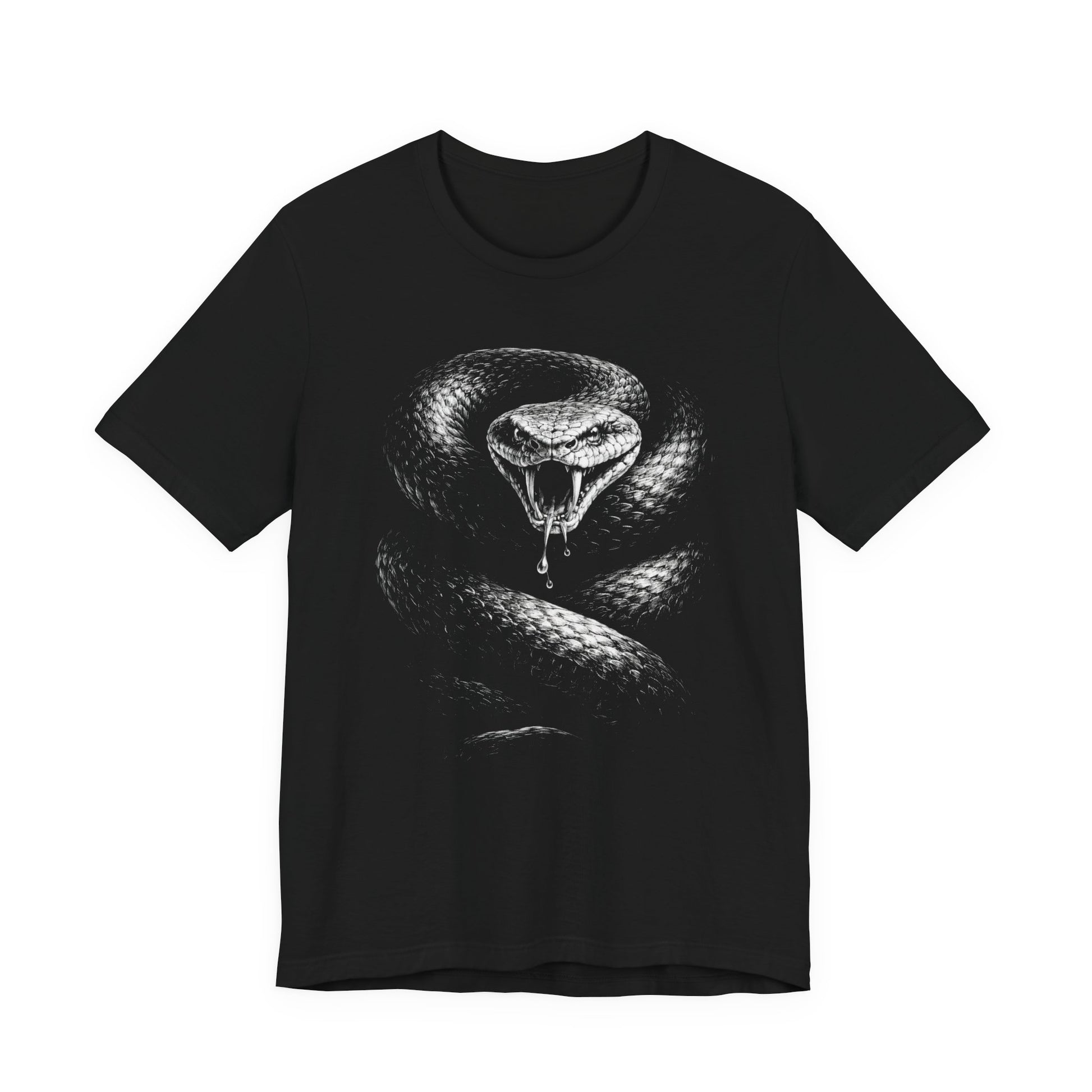 A dark, striking tee that channels quiet menace and cold confidence. The high-contrast monochrome snake print wraps the chest like a coiled warning — detailed scales, exposed fangs, and a dripping tongue rendered with crisp, tattoo-style linework. Lightweight Airlume combed cotton keeps the shirt breathable and easy to layer, while the retail fit and crew neckline give it a clean, wearable silhouette that works from late-night shows to everyday streetwear. Ethically made and REACH certified, the shirt feels thoughtful in both craft and conscience — it’s for people who prefer their style sharp, deliberate, and a little dangerous.