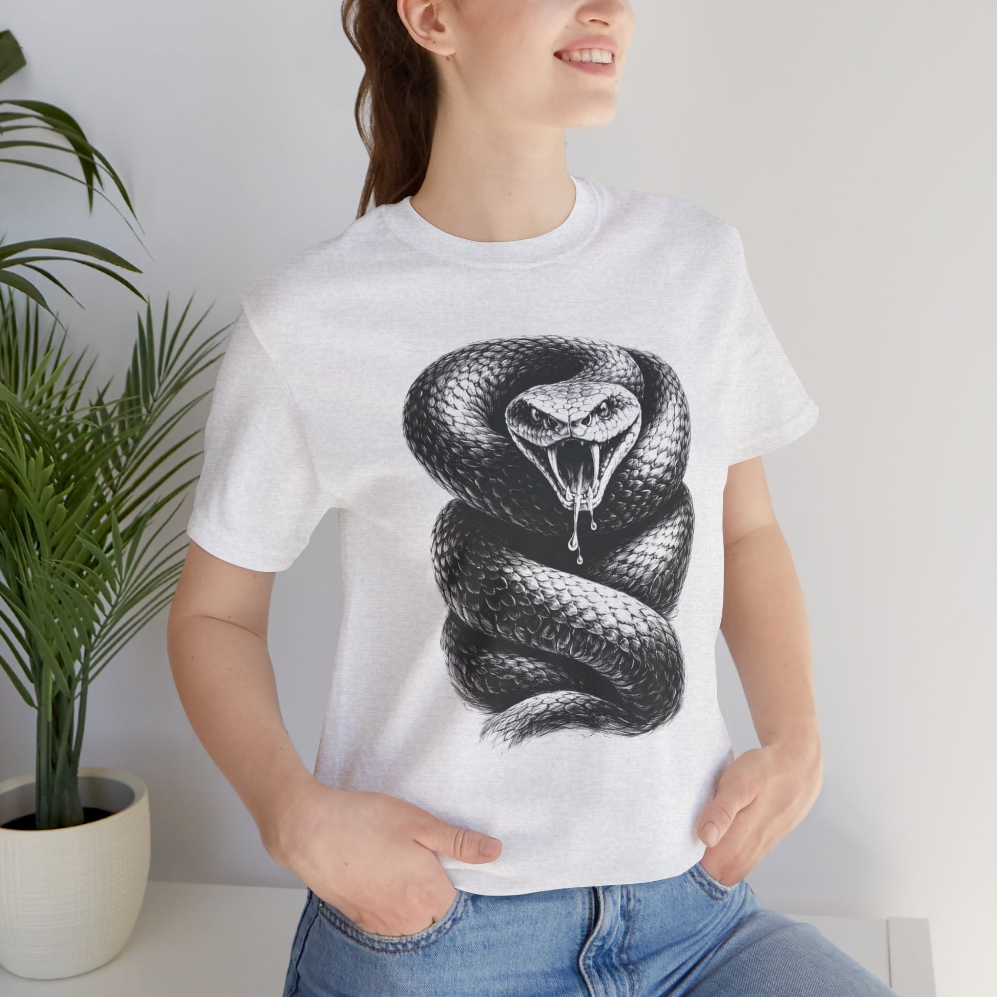 This breathable, lightweight tee puts bold, hand-inked attitude at your fingertips. A striking monochrome serpent coils across the chest, its scales rendered in fine detail so the image reads like an old tattoo or etching. The crew neckline and retail fit keep the silhouette clean and easy to layer. Wear it to add a tension-filled focal point to everyday looks — under a worn denim jacket, with cutoffs at an outdoor show, or layered with a flannel on late-night walks. It’s for people who prefer visual stories over slogans: dark, precise, and quietly confrontational.